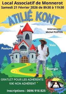 L'association LANBELI vous propose un atelier conte (posture, voix, énergie) samedi 21 février 2026 de 8h30 à 11h30 au local associatif de Monnérot (au Robert) avec Michel Platon.
