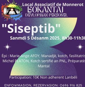 L'association Lanbéli vous invite à son "Bokantaj Dévlopman personel : Siseptib" samedi 6 décembre 2025 de 8h30 à 11h30 animé par Marie-Ange AFOY (Manageuse, Coach, Facilitatrice) et Michel PLATON (Coach certifié en PNL, Préparateur mental) au local associatif de Monnerot.