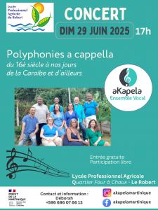 L’association AKAPELA a le plaisir de vous convier au concert de "l'Ensemble vocal aKapela", qui se tiendra le Dimanche 29 juin 2025 à 17h au Lycée Professionnel Agricole du Robert.