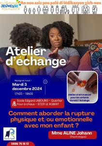 L'association MARTINIQUE JEUNESSE SOLIDARITE avec la collaboration du service éducation de la ville organise une conférence le mardi 3 décembre 2024 de 17h à 19h à l'école Edgard Labourg de Four à Chaux.