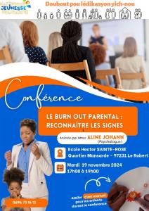 L'association MARTINIQUE JEUNESSE SOLIDARITE organise une conférence le mardi 19 novembre 2024 de 17h à 19h à l'école Hector Sainte-Rose de Mansarde.