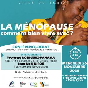 Dans le cadre des Ateliers Santé Ville, la cellule de la Politique de la Ville organise un temps d'information et d’interaction le mercredi 26 novembre 2025 de 18h à 20h au réfectoire de l’école Émile CAPGRAS à Pointe Lynch. Venez vous informer sur les effets de la ménopause.