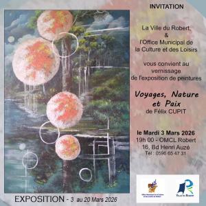 La présidente de l'Office Municipal de la Culture et des Loisirs du Robert Madame Gina JEAN-FRANCOIS vous invite Mardi 3 Mars 2026 au vernissage de l'exposition de peintures "Voyage, Paix et Nature" de l'artiste Félix CUPIT à 19h à l'OMCLR Bd Henri Auzé.
