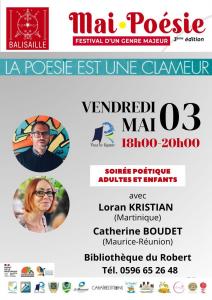Pour la 3ème édition du festival Mai Poésie la bibliothèque municipale vous invite à une soirée poétique adultes et enfants avec Loran KRISTIAN et Catherine BOUDET vendredi 3 mai 2024 de 18h à 20h.