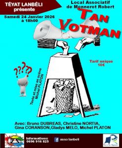 L'association Lanbéli vous propose la pièce de théâtre "TAN VOTMAN" avec Téyat Lanbéli samedi 24 janvier 2026 à 18h au local associatif de Monnérot.