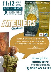 La présidente de l’OMCLR, Mme Gina Jean-François, vous invite à participer gratuitement aux ateliers des Journées Nationales des Artistes, animés par Dami (Danielle MIRAM-MARTHE-ROSE), les 11 et 12 septembre 2025 de 9h à 11h ou 11h à 13h à l'OMCL du Robert.