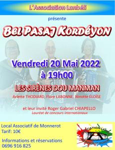 L'association Lanbéli présente "Bel Pasaj Kordéyon" avec Les Sirènes Dou Manman et leur invité Roger Gabriel CHIAPELLO vendredi 20 mai 2022 à 19h au local associatif de Monnerot