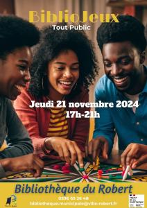 La bibliothèque municipale vous convie à son atelier BIBLIOJEUX (tout public) de 17h à 21h à la bibliothèque.