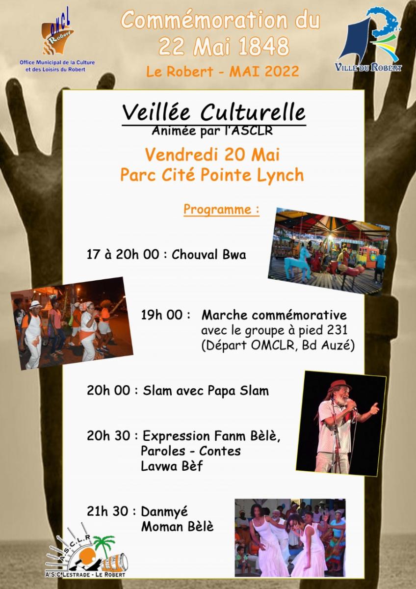 La Ville du Robert, l'Office Municipal de la Culture et des Loisirs du Robert, en partenariat avec l'Association Sportive et Culturelle de Lestrade-Robert (ASCLR), l'association Service de la Médiation Sociale (SMS) ont le plaisir de vous inviter à leur veillée culturelle Vendredi 20 mai 2022 au Parc de la Cité de Pointe Lynch.