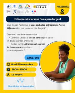Le carrefour de l'entrepreneuriat vous propose de participer à une rencontre le mardi 25 novembre 2025 de 9h à 12h à l'Antenne Municipale de Développement et de Cohésion Sociale - 1er étage du LCR de Pointe Lynch au Robert