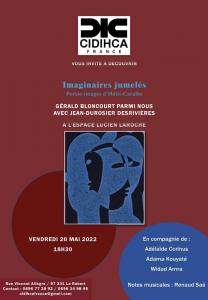 Le Centre International de Documentation et d'Information Haïtienne, Caribéenne et Afro-canadienne de France vous invite à sa conférence littéraire autour du livre "Imaginaires jumelés" vendredi 20 mai 2022 à 18h30 à l'espace Lucien Laroche en compagnie de Adélaïde Corinus, Adama Kouyaté, Widad Amra et Renaud Saé ( Notes musicales).