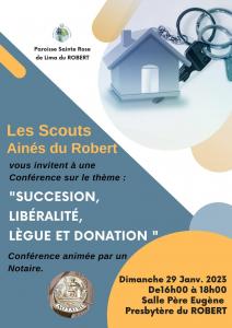 Les scouts aînés du Robert vous invitent à une conférence débat de 16h00 à 18h00 sur le thème de la succession, libéralité, lègue et donation au presbytère de l'église du Robert. Cette conférence sera animée par un notaire.
