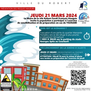 Soyons prêts en cas de TSUNAMI Le Maire de la ville du Robert Farell François-Haugrin invite la population à participer à l'EXERCICE CARAÏBE WAVE 2024 JEUDI 21 MARS 2024