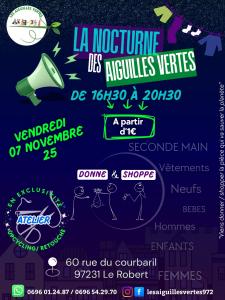 L'association LES AIGUILLES VERTES vous attendent pour sa première nocturne le vendredi 07 novembre 2025 de 16h30 à 20h30 au showroom situé 60 rue du Courbaril au Robert.