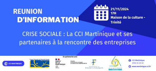 La Chambre de Commerce et d'Industrie de la Martinique (CCI Martinique), en partenariat avec la Ville de La Trinité, la CGSS, la DRFIP et la DEETS, organise une rencontre pour soutenir les entreprises les plus affectées. Cette initiative a pour but d'informer les dirigeants concernés sur les dispositifs existants qu'ils peuvent mobiliser à court terme et de les accompagner dans leurs démarches.