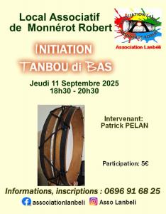 L'association Lanbeli vous convie à une initiation tanbou di bas animée par Patrick PELAN, le Jeudi 11 septembre 2025 de 18h30 à 20h30 au Local Associatif de Monnérot au Robert.