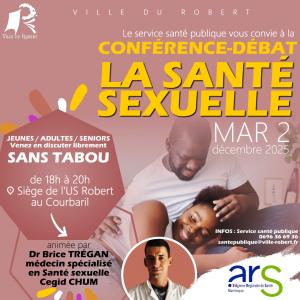 Le service santé publique de la ville du Robert vous convie à la conférence-débat "La santé sexuelle" animée par Dr Brice TRÉGAN médecin spécialisé en Santé sexuelle Cegid CHUM mardi 2 décembre 2025 de 18h à 20h au siège de l'US Robert au Courbaril. Jeunes, adultes, séniors, venez en discuter librement SANS TABOU !