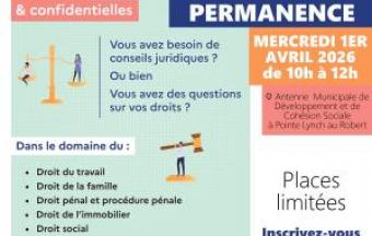 Vous avez besoin de conseils juridiques ? Vous avez des questions sur vos droits ? PERMANENCE DES CONSULTATIONS JURIDIQUES GRATUITES ET CONFIDENTIELLES qui aura lieu ce MERCREDI 1ER AVRIL 2026 de 10h à 12h à l' Antenne Municipale de Développement et de Cohésion Sociale - Étage du LCR de la Cité...