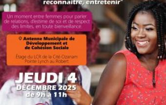 La ville du Robert et l'Union des Femmes de Martinique invitent les femmes à participer à un atelier sur la thématique "Relations saines : comprendre, reconnaître, entretenir" le jeudi 4 décembre 2025 de 9h à 11h à l'Antenne Municipale de Développement et de Cohésion Sociale. Il s'agit à travers...