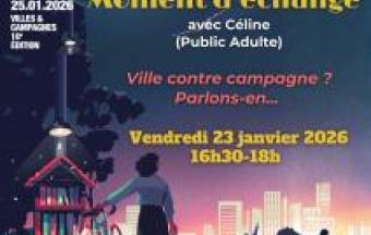 Dans le cadre de la nuit de la lecture, la bibliothèque municipale du Robert vous invite vendredi 23 janvier 2026 de 16h30 à 18h à son moment d'échange avec Céline sur le thème "Ville contre compagne ? Parlons-en...".