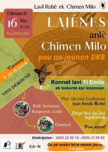 L'association CHIMEN MILO et la ville du Robert vous proposent dimanche 16 mars 2025 sur la place des Cités Unies (bord de mer) de 9h à 14h "LAJÉNÈS ANLÈ CHIMEN MILO POU AN JOUNEN DKB" pour les enfants de 6 à 16 ans.