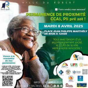 Vous avez besoin d'un accompagnement social ou professionnel, le CCAS de la ville du Robert, vient à votre rencontre pour vous aider le MARDI 08 Avril de 8h30 à 12h30 sur la place Jean-Philippe MARTHELY avec ses partenaires (habitat, retraite, santé, tutelle, Handicap, Appui Aidant familial, aides administratives,...).