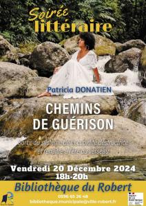La bibliothèque municipale du Robert vous propose ce Vendredi 20 Décembre 2024 de 18h à 20h "SOIREE LITTERAIRE" avec "Patricia DONATIEN"